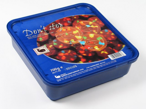 Freia Twist, en boks med biter av sjokolade og karameller trukket i lys- eller mørk sjokolade.