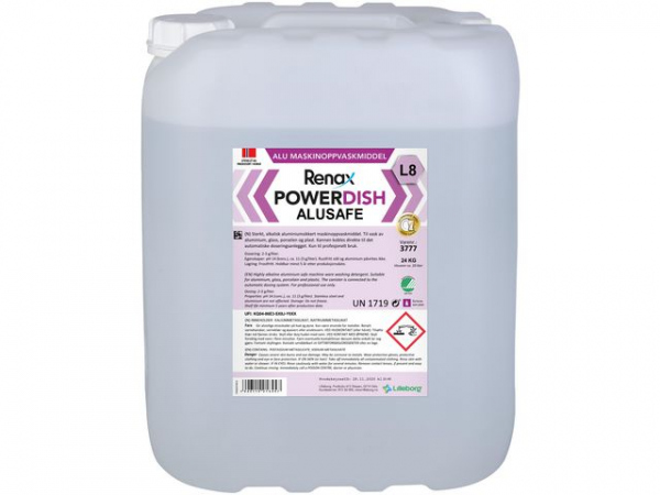 Renax PowerDish AluSafe L8 er et sterkt alkalisk, ikke-korroderende oppvaskmiddel som benyttes til vask av glass, porselen, plast og bestikk.