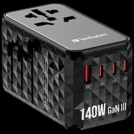 The Verbatim GaN III Universal Travel Adapter UTA-06 is a compact and versatile solution for travelers. It supports over 180 countries, offering EU, UK, US, Australia, and China plug options.