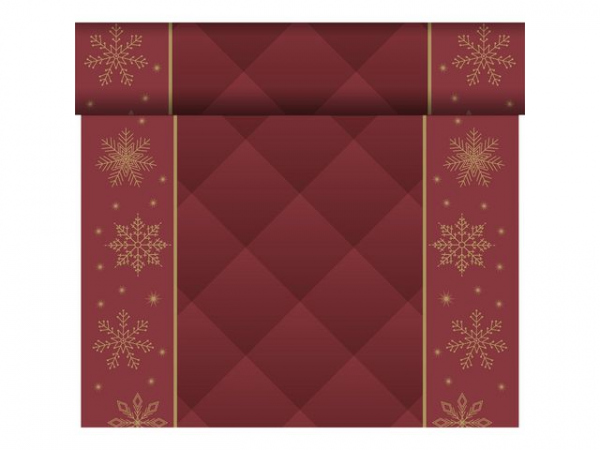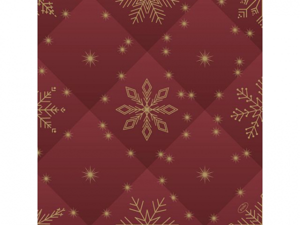Servietter i serien Rhombus byr på et fengslende design med gylne romber og delikate snøflak satt mot et rikt rødt bakteppe.