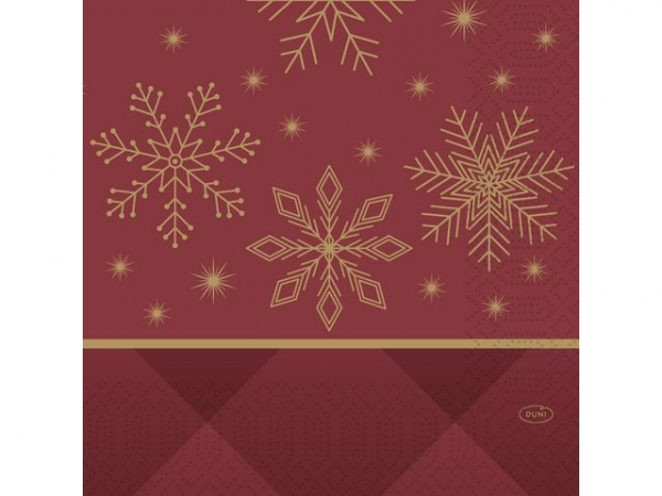 Dunilin tekstillignende servietter med et fengslende design hvor gylne romber og delikate snøflak er satt mot et rikt rødt bakteppe.