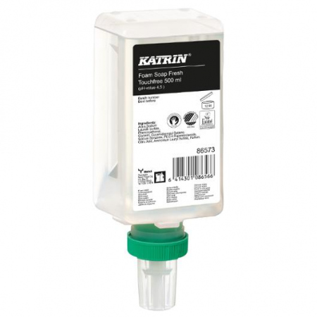 Katrin Touchfree Green er en forfriskende flytende såpe med mild duft av bjørk og gir en luksuriøs følelse av rene og fuktige hender. En berøringsfri løsning med automatisk dosering. En kremet såpe som etterlater hendene myke og fuktige, huden blir ren og får en frisk duft som sitter lenge.