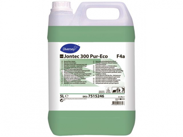 Taski Jontec 300 Pur-Eco er pH nøytral og godt egnet for bruk i combimat eller med mopp. Produktet gir effektiv rengjøring selv med lav dosering og etterlater ingen hinne på gulvet.