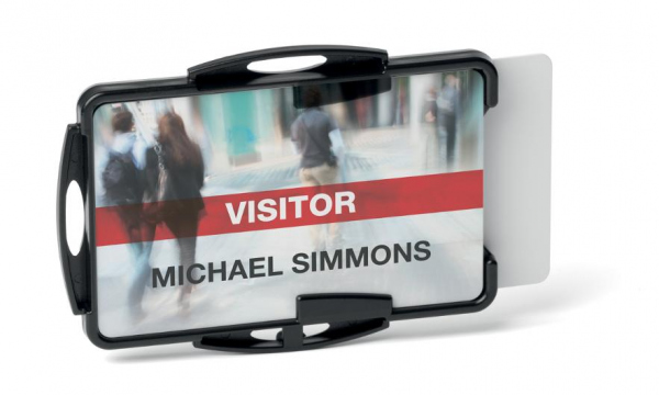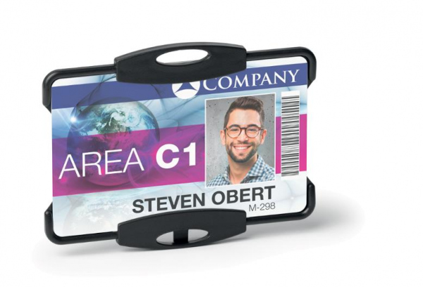 Robust kortholder med plass til to kort, laget av slitesterk polypropylen. Tommelgrep gir enkel tilgang til kortene. Brukes med tekstilhalsbånd, jojo eller stroppklemme, og kan stilles både stående og liggende. Passer kort i standardstørrelse 54x85 mm.