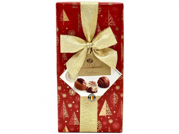 Esken inneholder 10 praliner, pakket inn for seg, fyllt med nougat, hasselnøtt og pistasj trukket i sjokolade. Perfekt til deiling eller som gave.