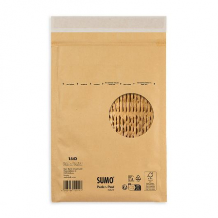 Sumo polstrede konvolutter er både konvolutten og støtdempingen laget av papir. Sumo konvolutter inneholder ikke plast og er derfor resirkulerbare. Posen har selvklebende lukking, med en dekkremse som rives av.